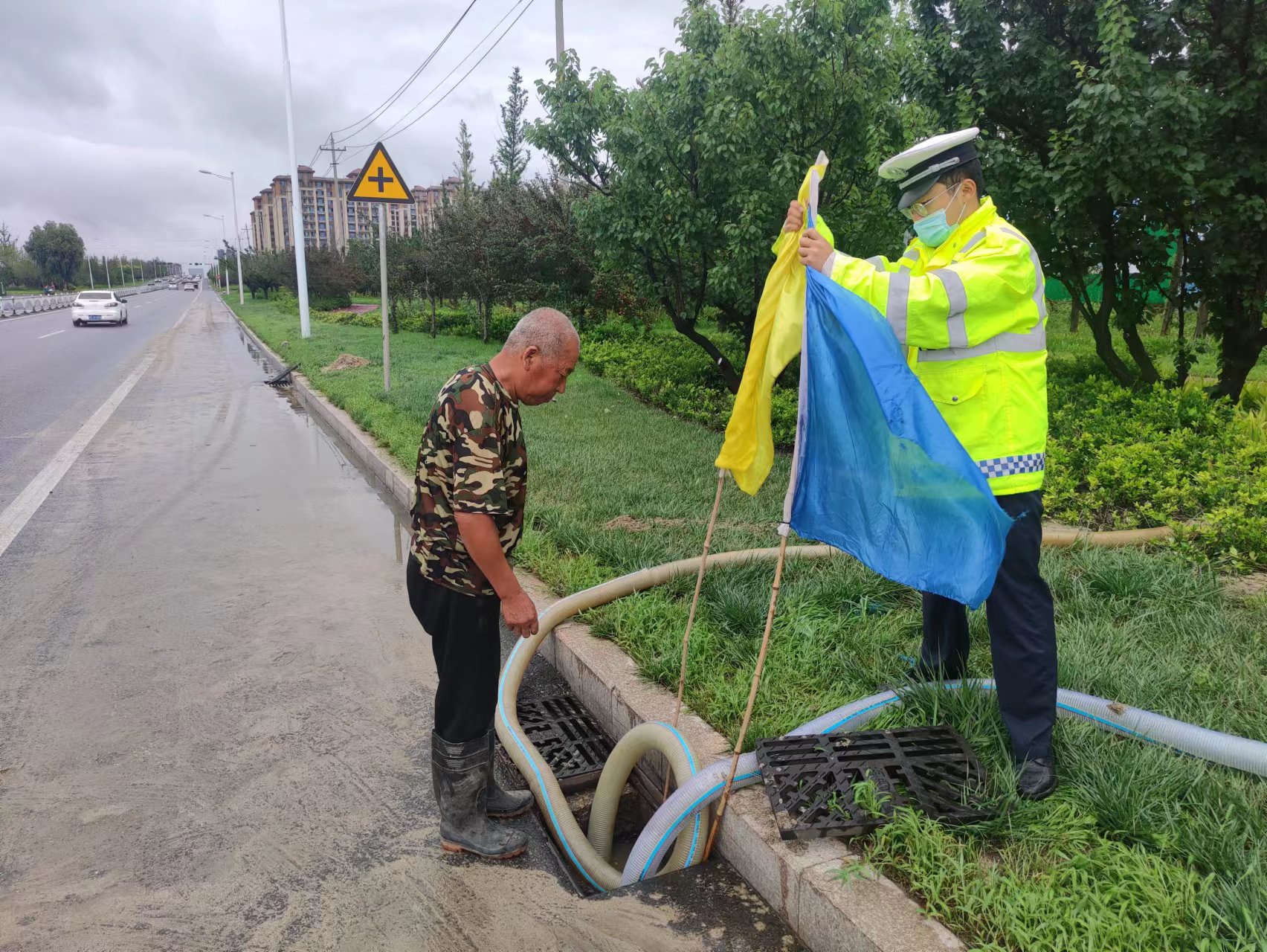为确保辖区道路安全畅通,8月9日,威海市交警六大队加强交通指挥疏导,强化对易积水重点路段和车流量较大路口的管控力度,冒雨做好交通指挥疏导工作。同时安排警力对辖区易发生积水路段、陡坡、弯路等增加巡逻密度,及时排查交通堵点,消除交通安全隐患,全力保障道路交通安全有序畅通。上午10时许,大队执勤民警巡逻至开元东路时,发现此路段积水严重,存在较大安全隐患,执勤民警立即下车与防汛人员一起在积水严重路段摆放警示桩,指挥疏导车辆绕行,并联系相关部门,及时对堵住的下水道进行疏通排水。