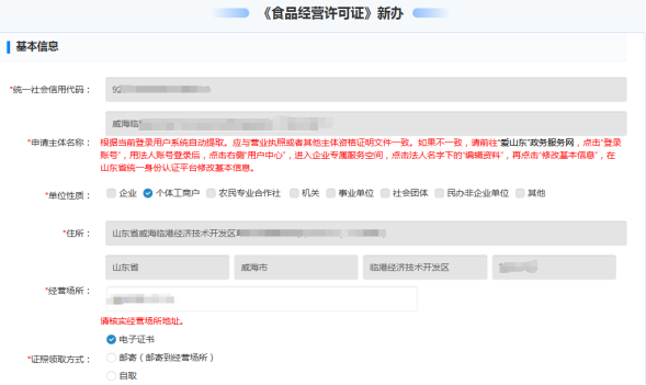 系统通过营业执照信息智能获取,自动从相关数据库中获取企业及个体户的营业执照登记信息,并精准预填至申报表单,在每个填写区域增设鼠标悬浮提示功能,以助力申请人更清晰地理解填写要求,提高填写准确性。申请人根据需求自主选择证照领取方式。