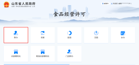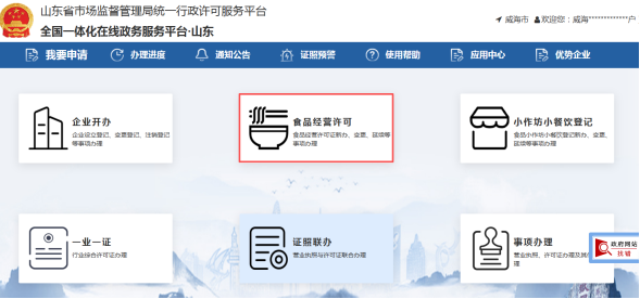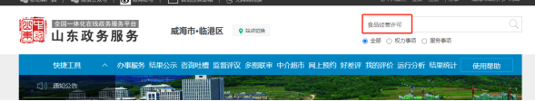 在山东政务服务网威海市临港区站点搜索“食品经营许可”,选择“食品经营许可新办审批(县级权限)”,进行法人登录后,点击“我要申报”,选择“省政务服务网登录入口”后进行在线申报。