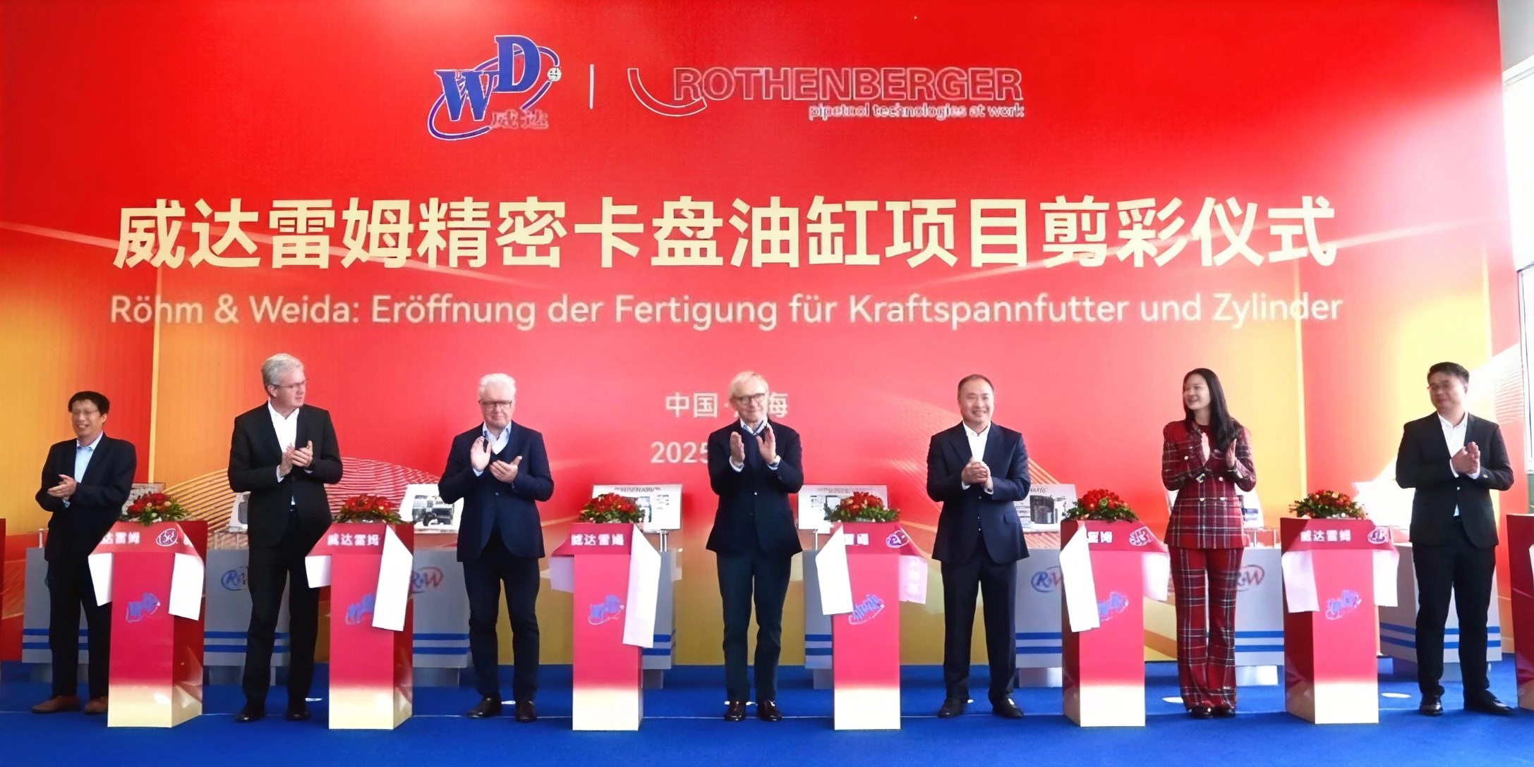 赫尔穆特·罗森博格、宫本杲、杨明燕、约翰·克里默、马丁·考夫曼为威达雷姆精密卡盘油缸项目现场剪彩。