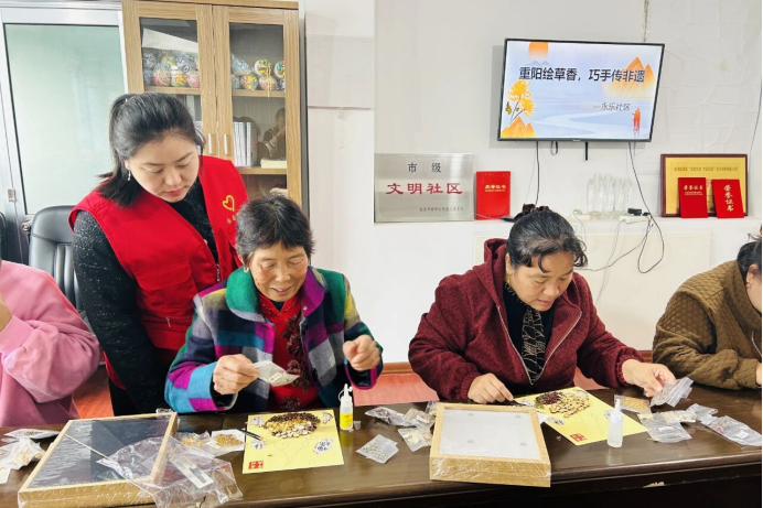 永乐社区开展“重阳绘草香 巧手传非遗”中草药画制作活动,让老人们在指尖创作中感受节日与非遗的双重暖意。活动室内,在社区志愿者的指导下,大家挑选艾叶、薄荷、桂枝等具有安神、驱味功效的中草药,按照自己的创意搭配摆放,再用胶水固定在画框中,一幅幅兼具观赏性与实用性的香氛画逐渐成型。过程中,居民们相互交流技巧、分享生活趣事,现场氛围温馨融洽,非遗文化的魅力也在动手实践中传递。