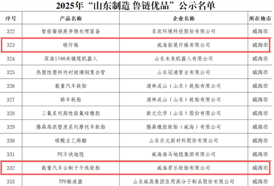 近日,山东省工业和信息化厅公示2025年“山东制造 鲁链优品”(第一批)名单,我区威海拓展纤维有限公司的碳纤维产品、威海君乐轮胎有限公司的载重汽车公制子午线轮胎产品成功入选。