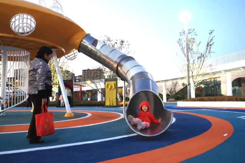 不仅如此,临港区中法低碳生态城・青年体育公园打破了传统公园的功能边界——中间的“智慧活力跑道”,通过物联网与光影交互技术,让跑步不再无趣;西边的“星际童乐园”里,飞船滑梯、星际秋千让孩子玩得不想走;南边的“新青年球场”上,年轻人组队打网球、踢足球,汗水洒在绿茵场;东边的“星乐文化广场”,傍晚时分总有广场舞队伍和秧歌队“同台”,热闹却不拥挤。