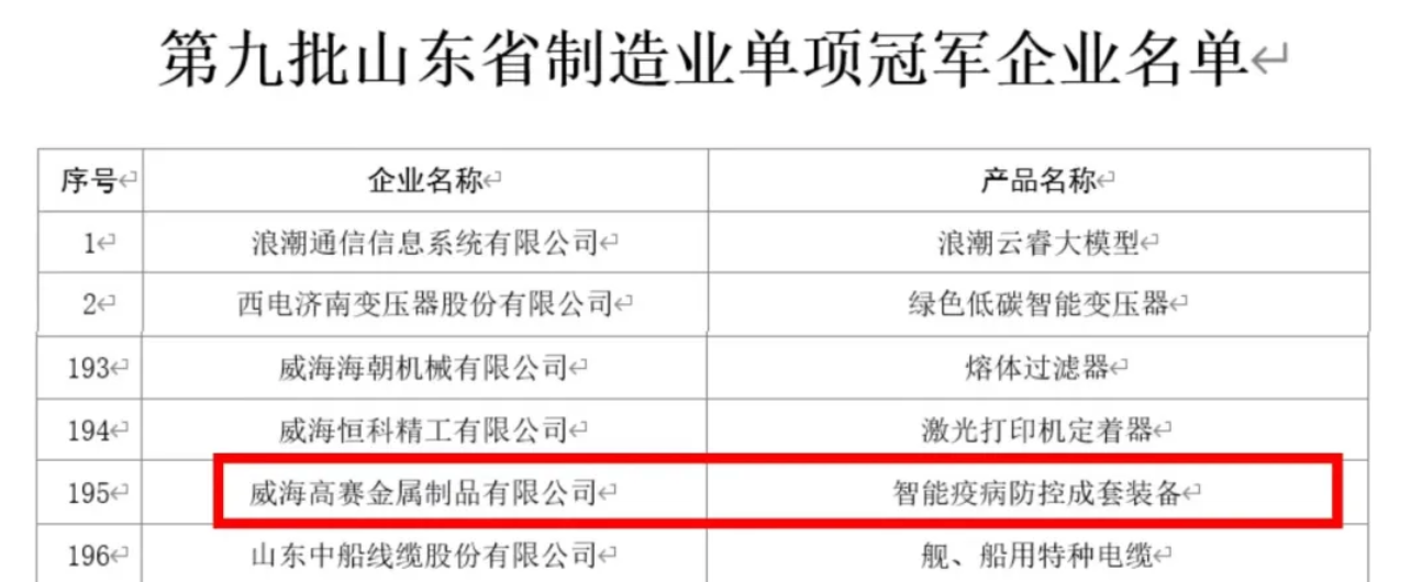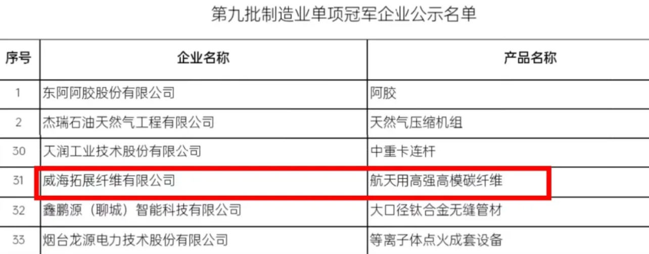 近日,国家工信部印发了《工业和信息化部关于印发第九批制造业单项冠军企业及复核通过第三批、第六批制造业单项冠军企业名单的通知》,位于临港区的威海拓展纤维有限公司依托航天用高强高模碳纤维的市场优势入选;山东省工业和信息化厅发布了《关于公布第九批山东省制造业单项冠军企业和通过复核的第三、六批制造业单项冠军企业名单的通知》,位于临港区的威海高赛金属制品有限公司凭借智能疫病防控成套装备上榜。