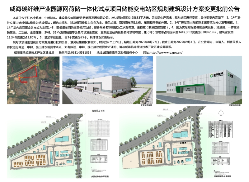 威海碳纤维产业园源网荷储一体化试点项目储能变电站区规划建筑设计方案变更批前公告