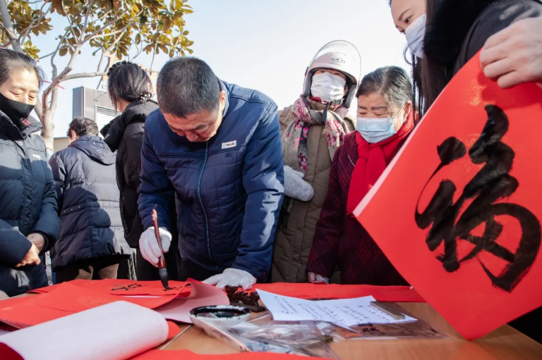活动现场,书法家们热情饱满,笔走龙蛇,挥毫泼墨,把一副副春联和一张张“福”字送到老百姓手中。前来领取春联的居民络绎不绝,居民喜笑颜开,浓浓的墨香与节庆的欢愉在空气中交织弥漫。