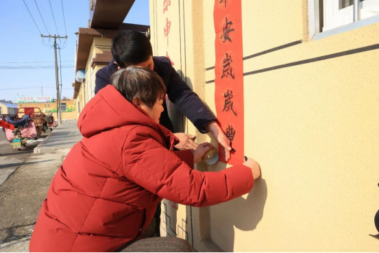 一大早,志愿者们便带着提前书写好的春联、寓意吉祥的“福”字和喜庆的新年窗花,如约抵达乐申幸福苑。在幸福苑门口,志愿者与南申格村“两委”干部默契联动、分工协作,有人踮起脚尖,仔细对齐门框张贴春联,一笔一画的红底黑字,承载着对老人的美好祝愿;有人坐在老人身边,手把手陪着粘贴窗花,指尖相触间,把最真挚的关爱传递给每一位老人。