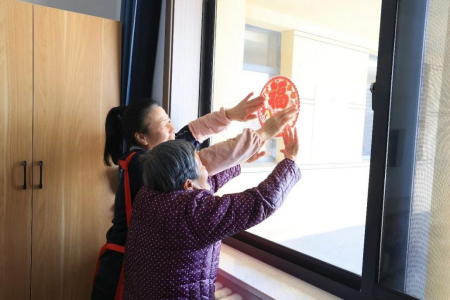 红彤彤的春联缀满门框,圆润饱满的“福”字贴满墙面,灵动可爱的窗花生动点缀,原本素雅的幸福苑房间,瞬间被浓浓的年味包裹,每一个角落都洋溢着热闹祥和的节日氛围,也藏着邻里相伴的和谐暖意。