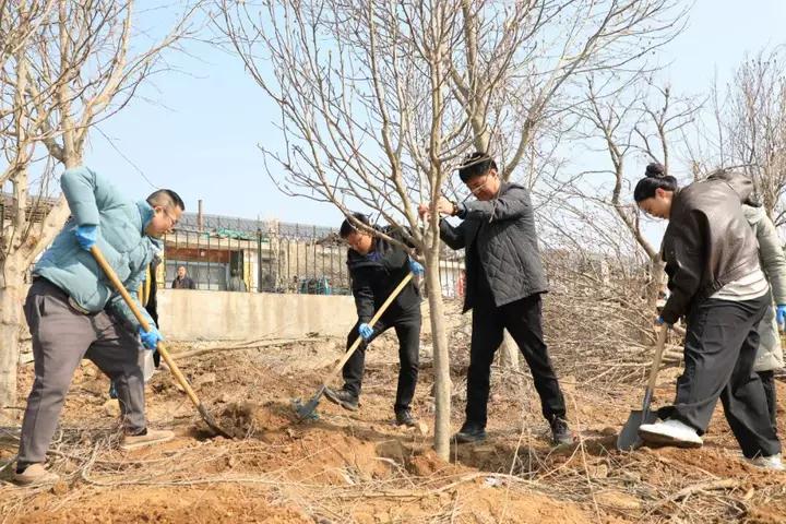 挥锹铲土、植树苗,现场一派热火朝天、干劲十足的景象,干群分工协作、默契配合,认真细致地挥锹培土、扶苗正干、提水浇灌,成为春日里最动人的风景线。